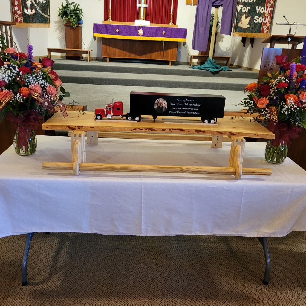 The truck is my cousin’s urn. He was a trucker his whole life. This is the platform I made for the pall bearers to carry the urn on. My cousin was a very good man and will be greatly missed by all that knew him.